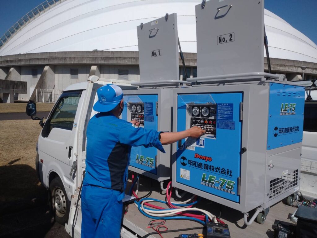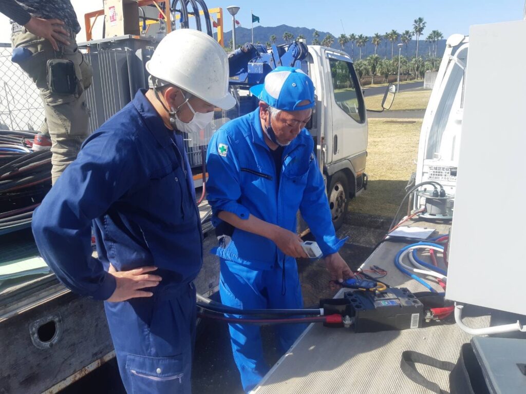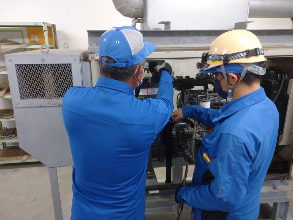 宮崎県このはなドーム、陸上競技場の自家発電設備の点検を協力業者様と一緒に行いました。